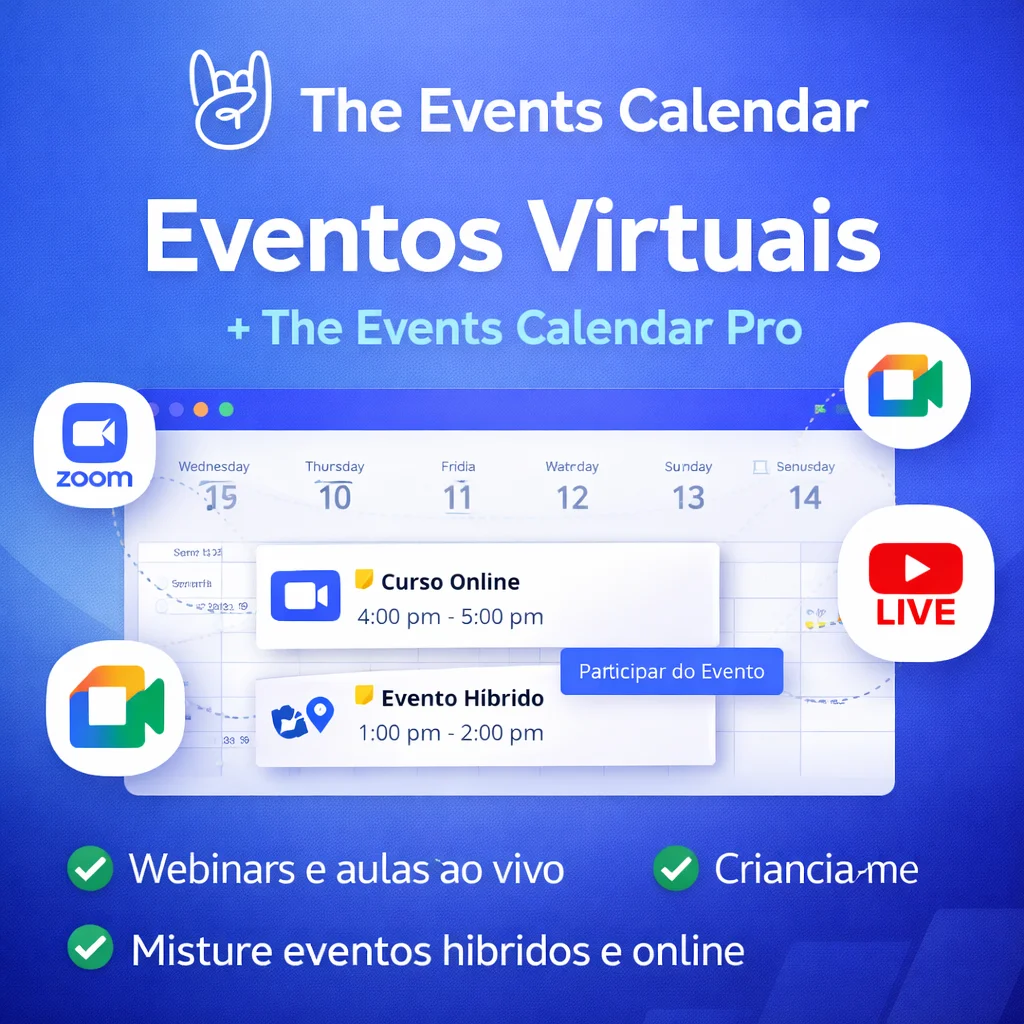 O Complemento para Eventos Virtuais do The Events Calendar Pro amplia os recursos do calendário, permitindo criar, gerenciar e destacar eventos online, presenciais ou híbridos de forma simples e organizada.