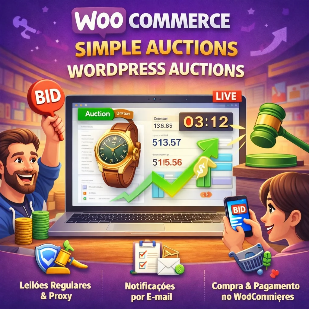 O WooCommerce Simple Auctions – WordPress Auctions é um plugin completo que adiciona funcionalidade profissional de leilões diretamente dentro do seu WordPress, sem plataformas externas, sem sistemas complicados e sem dores de cabeça técnicas. Em poucos cliques, sua loja tradicional se transforma em um marketplace dinâmico, interativo e altamente envolvente, onde os clientes não apenas compram… eles disputam, acompanham, retornam e se divertem 🛒💥.
